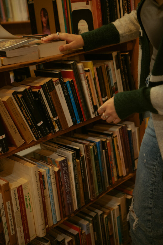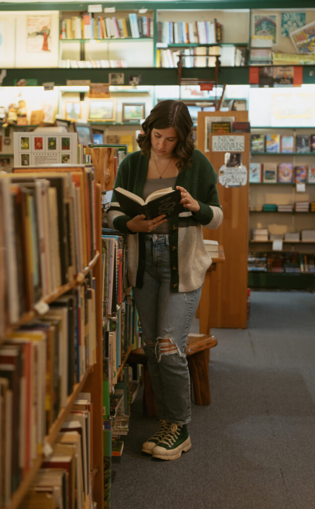 Example: Tsunami Books and Daffodil Books in Eugene have that classic Oregon bookstore charm — soft light, stacked shelves, and plenty of cozy spots to tuck away together.